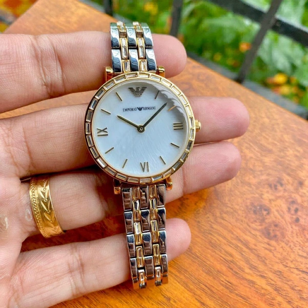 Display indicators-Two Tone Colour roman numbers at 3, 6, and 9 O’clock and the Emporio Armani logo at 12, rest all Index numbers